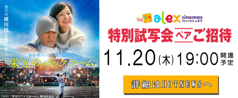11月20日(木)『栄光のバックホーム』特別試写会ペアご招待! 応募詳細は【HOTNEWS】コーナーにてご確認ください。 劇場版『チェンソーマン レゼ篇』 世界が熱狂するチェンソーマン、初の映画化! 絶大な人気を誇るエピソード“レゼ篇”が、11月7日(金)より敦賀のスクリーンへ てっぺんの向こうにあなたがいる 阪本順治監督×吉永小百合による 13年ぶりのタッグでおくる壮大なスケールの冒険譚 ただいま上映中 スマホでらくらく入場 【ココトル+】で予約すれば、券売機で並ぶ必要はありません! ムビチケ(前売券)情報 現在販売中のムビチケ(前売券)情報はコチラから! 入場者特典情報 現在配布中の入場者特典の情報はコチラから! アレックスシネマ公式X みなさまのフォローをお待ちしております! アレックスeクラブのお知らせ ポイントでもクーポンでもお得にお得に映画が鑑賞できる アレックスeクラブ 会員様受付中! スケジュール&座席予約SCHEDULE & SEAT RESERVATION アレックスeクラブログイン/新規入会 予約QR発行予約照会/キャンセル 作品紹介MOVIE INTRODUCTION インフォメーションINFORMATION HOT☆NEWS 『栄光のバックホーム』アレックスシネマ特別試写会決定! ★ ☆ 公開予定作品 ☆ ★ 【お知らせ】ココトル+で車いすスペースの利用が可能になりました オープン時間のご案内 アルバイトスタッフ 大募集! 『映画と一緒にお買い物!』アル・プラザ敦賀 専門店街 HP ニュース HOT★NEWS 入場者プレゼントのご案内 ムビチケカード(前売券)情報 設備・サービスについて よくあるご質問(FAQ) お問い合わせ CONTACT US